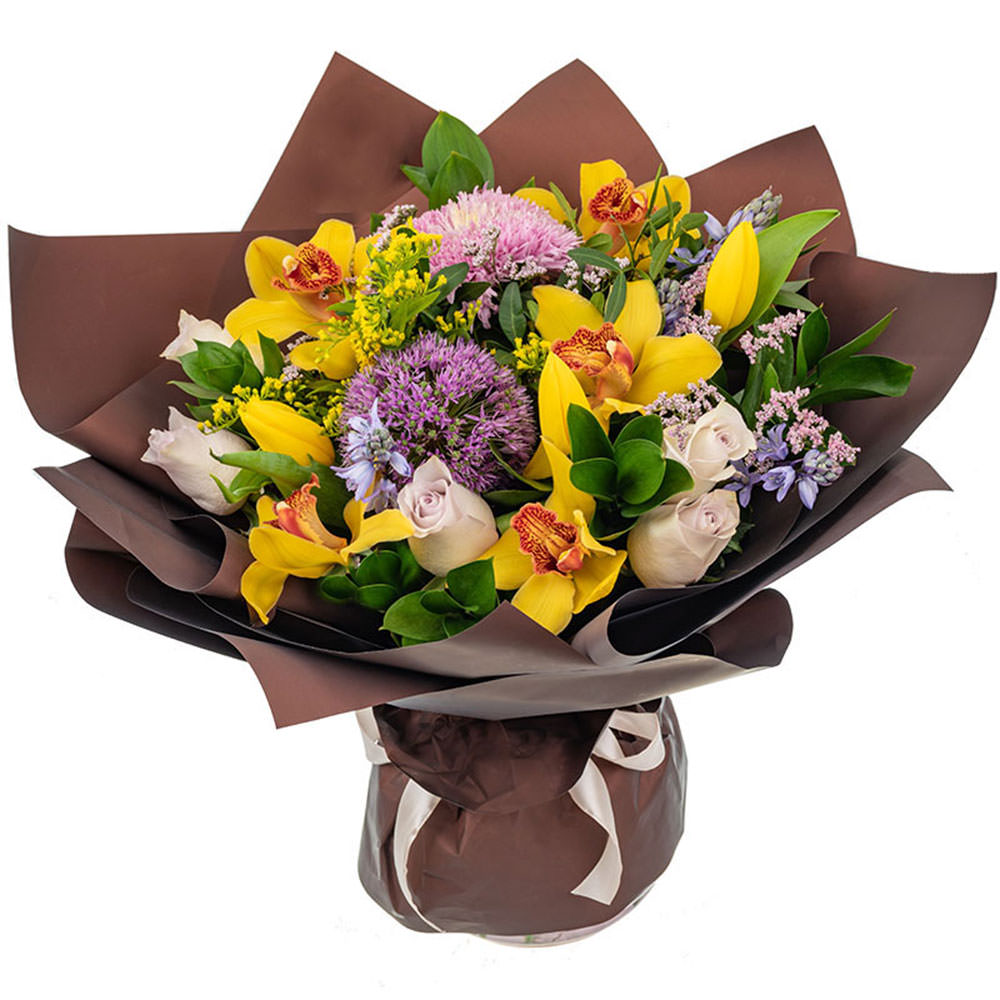 На фото представлен образец. Объем букета зависит от выбранного вами размера. Точное количество цветов и цветовую гамму вы можете уточнить у менеджера по телефону.