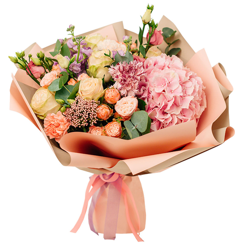 На фото представлен образец. Объем букета зависит от выбранного вами размера. Точное количество цветов и цветовую гамму вы можете уточнить у менеджера по телефону.
