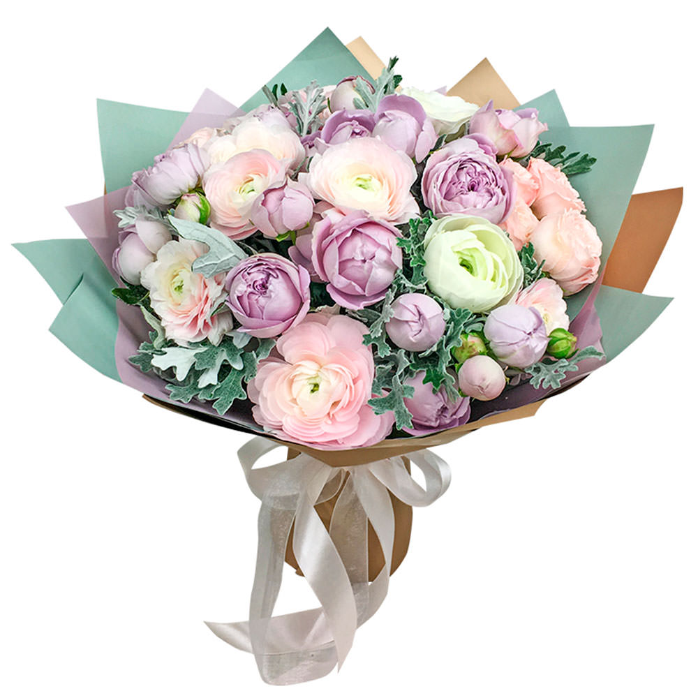 На фото представлен образец. Объем букета зависит от выбранного вами размера. Точное количество цветов и цветовую гамму вы можете уточнить у менеджера по телефону.