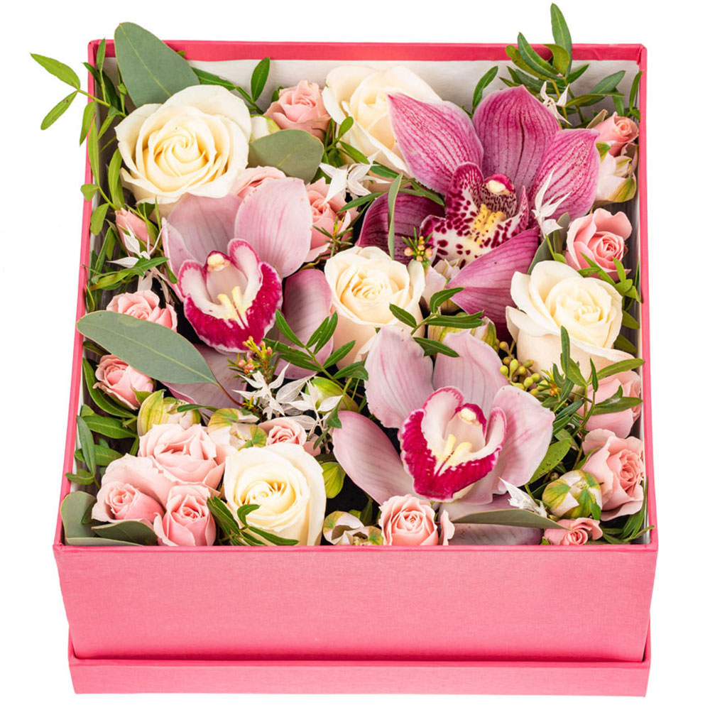 На фото представлен образец. Объем коробки зависит от выбранного вами размера. Точное количество цветов и цветовую гамму вы можете уточнить у менеджера по телефону.