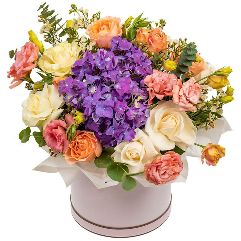 На фото представлен образец. Объем коробки зависит от выбранного вами размера. Точное количество цветов и цветовую гамму вы можете уточнить у менеджера по телефону.
